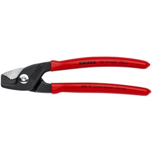Manici rivestiti in matieriale bicomponente, rinforzato in fibra di vetro. Con crimpatrice per terminali a bussola fino a 6,0 mm². Taglienti di precisione con dentatura fine per un taglio netto senza slittamento. Lame in acciaio inox, durezza di taglio 56 HRC. Con tasca in materiale sintetico per cintura.