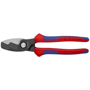 Manici rivestiti in resina sintetica - Acciaio per utensili bonificato, forgiato, temperato ad olio. Struttura ergonomica delle ganasce: aspetto del taglio ottimale. Il fermo di contrasto consente una lavorazione sicura. Taglia senza schiacciare. Articolazione a vite. Non idonea per filo di acciaio e funi metalliche. Taglienti temperati ad induzione, durezza dei taglienti ca. 56 HRC. Taglia cavi di grandi dimensioni in rame e alluminio fino a 5 x 4 mm² - Taglia cavi multipolari fini in rame e alluminio fino a Ø 15 mm (50 mm²). Il taglio risulta 40% più leggero.