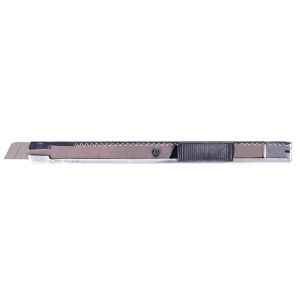 In ABS con meccanismo di sicurezza autobloccante. Terminale in metallo per lame a segmento affilate. Testa con intaglio spezza lama. Lama a spezzare da 9 mm con spessore da 0,4 mm. Ricambio art. 1720-1721.