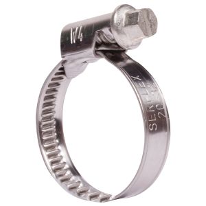 Interamente in acciaio inox SS 2333/AISI 304. Nastro da 9 mm con bordi rialzati. Vite esagonale da 7 mm con intaglio. Indicata per usi industriali, agricoli, chimici e nautica. Per tubi di piccoli diametri e tubi benzina. Confezione in sacchetto nylon.