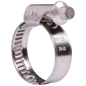 Larghezz nastro: 9 mm per misure 8-14-11-17-13-20, 12 mm da misura 15 a 24. Per usi industriali, agricoli, chimici e nautica. Bordi rialzati e superficie interna liscia. Vite a testa esagonale inox mm 7. In acciaio inox AISI 304 (W4).