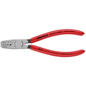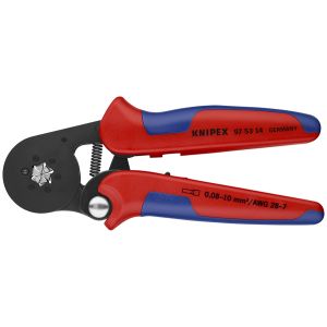Manici rivestiti in resina sintetica. Cromo vanadio, forgiato, temperato ad olio. Serraggio con profili trapezoidali per un giunto forte fra conduttore e terminale. Per serrare terminali a bussola secondo DIN 46228 con sezione da 0,25 a 2,5 mm².