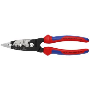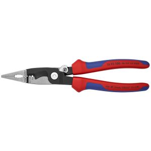 Manici rivestiti in materiale bicomponente. Esecuzione bonderizzata nera. Per la presa su materiali di forma piana e arrotondata, per piegare, tagliare cavi, togliere bave, spelare e crimpare. Con meccanismo a molla di ritenuta intelligente, permette la presa senza aprire la pinza che rimane chiusa e protetta. Fori spelacavi per conduttori 0,75- 1,5, 2,5 mm². Acciaio speciale per utensili, bonificato, forgiato, temperato ad olio e gradini. Cesoia con taglienti di precisione per cavi in rame e alluminimo fino a 5x2,5 mm²/Ø 15 mm.