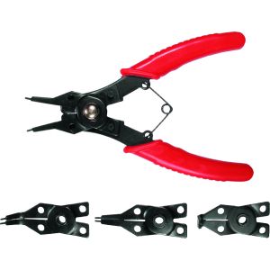 Pinza di precisione per anelli di sicurezza esterni su alberi. Con molla di apertura inserita - Finitura bonderizzata grigia. In acciaio cromo vanadio forgiato e temprato ad olio. Punte dritte in acciaio per molle temprato ed estruso. Articolazione a vite. Manici rivestiti in resina sintetica antiscivolo - DIN 5254 A.
