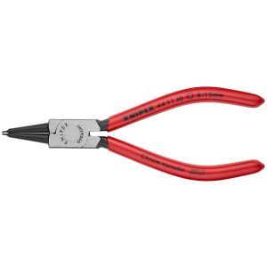 Pinza di precisione per anelli di sicurezza interni di sicurezza a fori. Finitura bonderizzata grigia. In acciaio cromo vanadio forgiato e temprato ad olio. Punte dritte in acciaio per molle temprato ed estruso. Articolazione a vite. Manici rivestiti in resina sintetica antiscivolo - DIN 5256 C.
