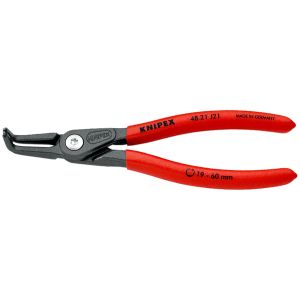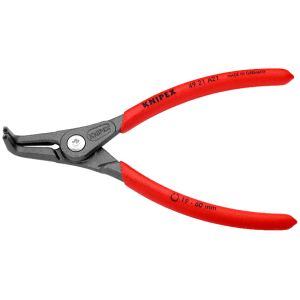 Pinza di precisione per anelli di sicurezza esterni su alberi. Con molla di apertura inserita - Finitura bonderizzata grigia. In acciaio cromo vanadio forgiato e temprato ad olio. Punte piegate a 90° in acciaio per molle temprato ed estruso. Articolazione a vite. Manici rivestiti in resina sintetica antiscivolo - DIN 5254 B.