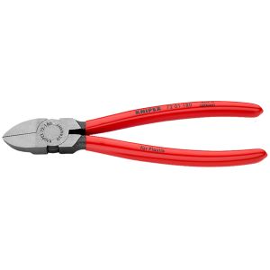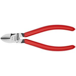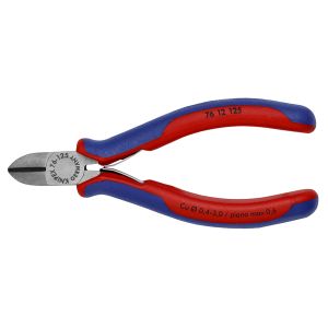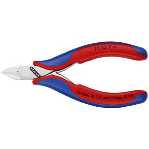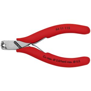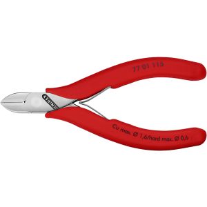 Manici rivestiti in resina sintetica antiscivolo. In acciaio cromo vanadio per cuscinetti a sfera, forgiato temperato ad olio. Tagliente frontale, senza sfaccettatura. Pinze adatte per il taglio di alta precisone nell'elettronica e nella meccanica fine. Taglienti temperati a laser, durezza dei taglienti minimo 56 HRC. Con doppia molla esente da attrito per un'apertura e una chiusura morbida ed uniforme. La superficie a specchio e uno strato fine di olio garantiscono la migliore protezione contro la ruggine.