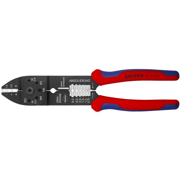Modello a ovale e a "F". Manici rivestiti in materiale bicomponente - Esecuzione verniciata nera. Per tagliare cavi, spelare fili e serrare terminali maschi e femmine preisolati e non isolati. Acciaio speciale ad alta resistenza. Con fori per troncare e viti filettati in rame e ottone con filettatura M2,6; M3; M3,5; M4 e M5. Articolazione a vite per un’elevata stabilità ed un movimento uniforme.