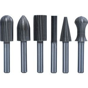 In acciaio HSS. Gambo da 6 mm. Per metalli non ferrosi come ottone, alluminio, plastica e legno. Non adatte per acciaio temprato. Adatte per l’uso con trapani.