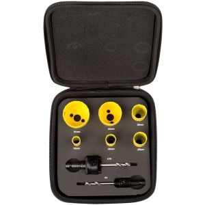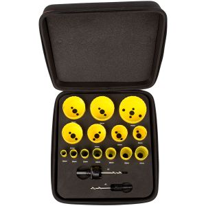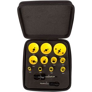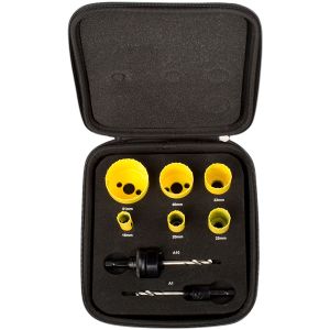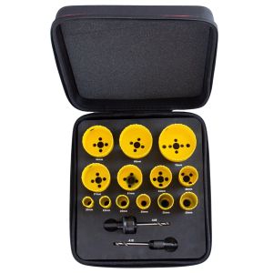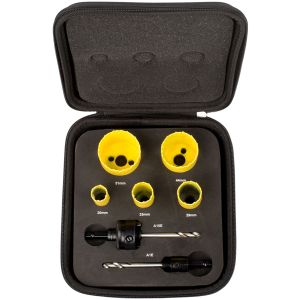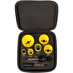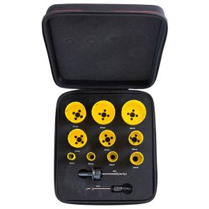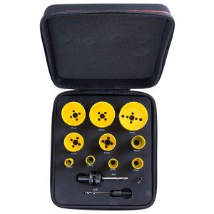 Bordo in acciaio HSS con aggiunta di cobalto. Gruppo sega a tazza completo di alberino, punte pilota e molla di espulsione, progettati specificatamente per utensili elettrici senza filo. Ideale per il taglio di lamiere in acciaio inossidabile, acciaio dolce, legno e plastica sottile. Profondità di taglio consigliata 3 mm.